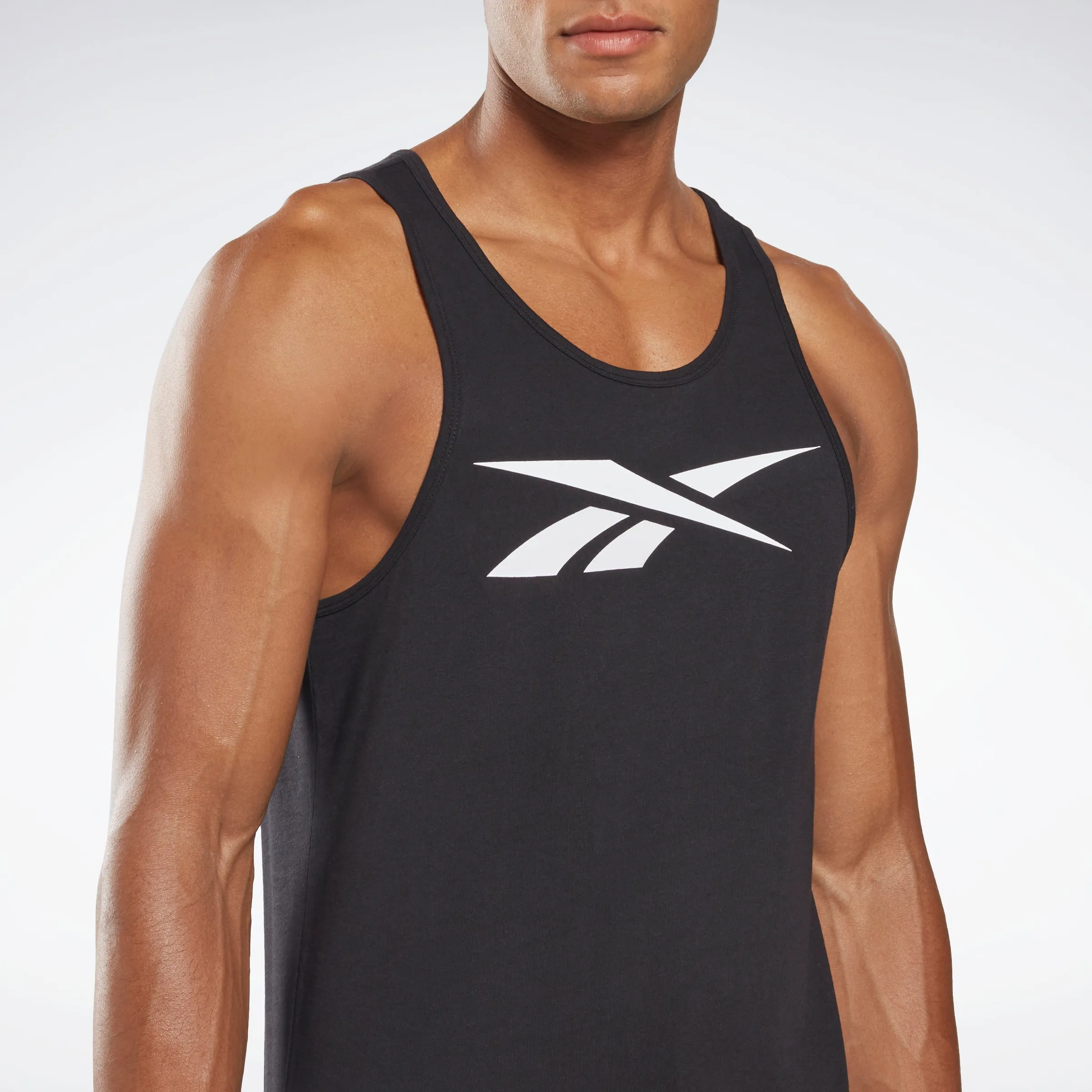 +Easy, breezy outfits are just a tank away. This men's Reebok tank top puts the iconic Vector logo at centre stage, giving any casual outfit a hit of athletic style. The cotton jersey fabric is soft and comfortable for all-day wear.